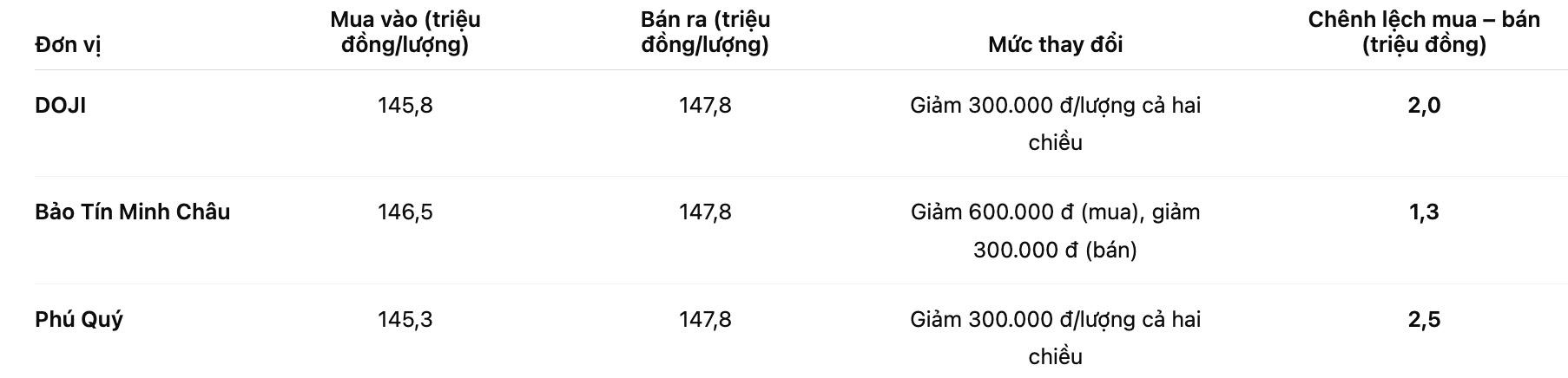 Tập đoàn Vàng Bạc Đá Quý Phú Quý niêm yết giá vàng miếng SJC ở ngưỡng 145,3-147,8 triệu đồng/lượng (mua vào - bán ra), giảm 300.000 đồng/lượng cả hai chiều. Chênh lệch giá mua vào - bán ra ở ngưỡng 2,5 triệu đồng/lượng.