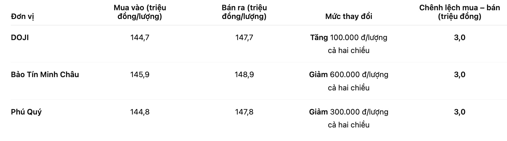 Giá vàng miếng SJC được Bảo Tín Minh Châu niêm yết ở ngưỡng 146,5-147,8 triệu đồng/lượng (mua vào - bán ra), giảm 600.000 đồng/lượng chiều mua vào và giảm 300.000 đồng/lượng chiều bán ra. Chênh lệch giá mua vào - bán ra ở ngưỡng 1,3 triệu đồng/lượng.