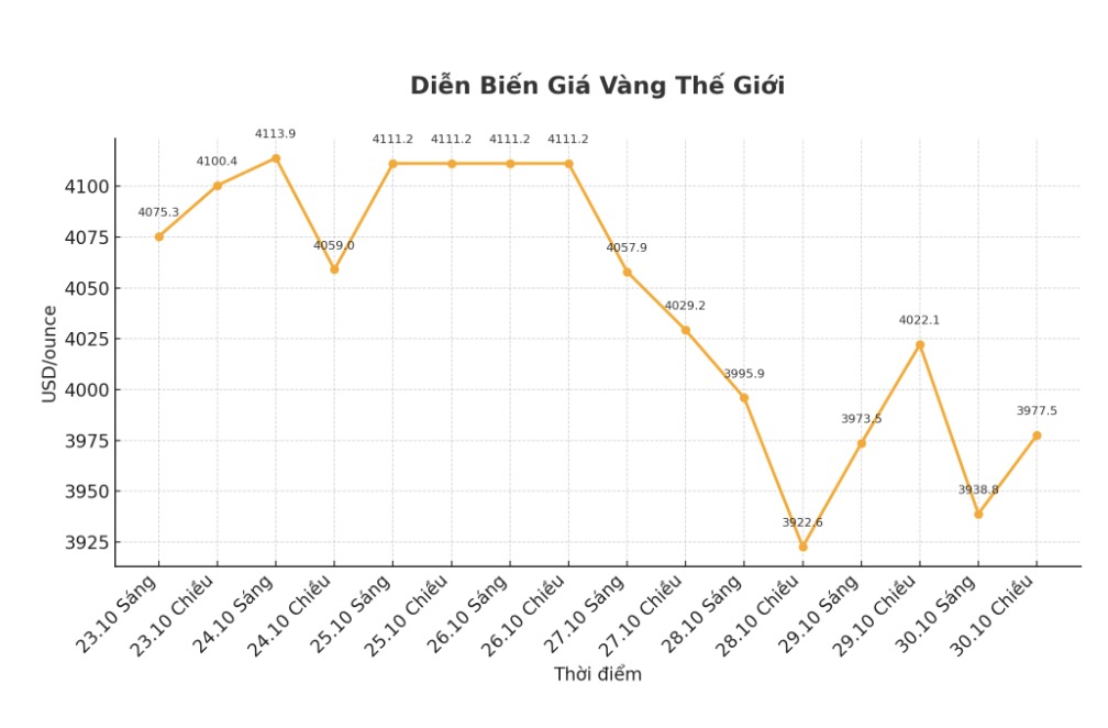 Giá vàng thế giới niêm yết lúc 18h00 ở ngưỡng 3.977,5 USD/ounce, giảm 44,6 USD so với một ngày trước.