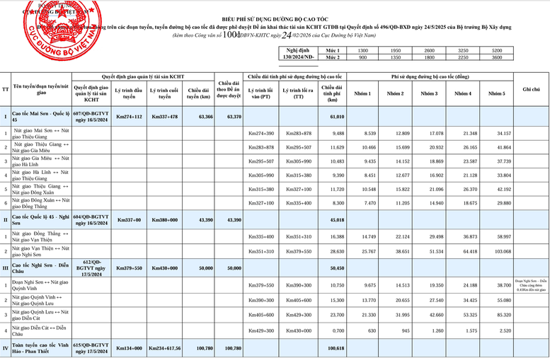 Mức phí cụ thể đối với 5 tuyến cao tốc: