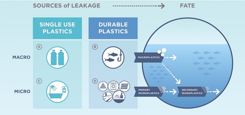 Nhựa được sử dụng trong rất nhiều hoạt động của doanh nghiệp và hộ gia đình, trên đất liền và trên biển. Tuy nhiên, phần lớn vi nhựa sơ cấp (98%) phát sinh từ các hoạt động trên đất liền, chỉ 2% được tạo ra từ các hoạt động trên biển. Vi nhựa sơ cấp phát sinh từ bẩy nguồn chiếm ưu thế gồm: hạt/viên nhựa, vải dệt tổng hợp, mài mòn lốp xe, vạch kẻ đường, sơn tàu, các sản phẩm chăm sóc cá nhân và bụi đô thị. Trong các nguồn trên, chỉ vi nhựa từ các sản phẩm chăm sóc cá nhân được coi là nguồn chất thải có chủ ý do cố ý đưa vi nhựa sơ cấp vào sản phẩm. Các nguồn khác tạo ra vi nhựa không chủ ý do mài mòn, do thời tiết hoặc do vô ý trong quá trình sản xuất, vận chuyển, sử dụng, bảo trì hoặc tái chế các sản phẩm có chứa nhựa. Các nguồn chính phát sinh vi nhựa có thể kể đến như sau: