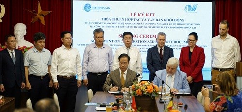 Lễ ký kết thỏa thuận hợp tác, khởi động dự án “Chuyển giao công nghệ Rioscan quản lý phòng ngừa rủi ro hệ thống thoát nước”. Ảnh: Đỗ Hoàng
