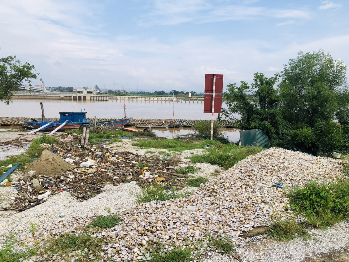 Người dân đổ vỏ ngao ra ven bờ Sông Lèn , địa bàn xã Vạn Lộc, tỉnh Thanh Hóa