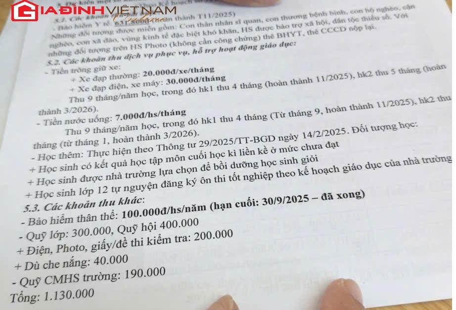 Cụ thể, theo chị B cho biết ngoài các khoản thu bắt buộc là bảo hiểm y tế, các khoản thu dịch vụ phục vụ, hỗ trợ hoạt động giáo dục thì còn các khoản thu khác như quỹ lớp: 300.000 đồng, quỹ hội: 400.000 đồng, quỹ cha mẹ học sinh trường: 190.000 đồng. Ngoài ra điện, photo, giấy/đề thi kiểm tra: 200.000 đồng, dù che nắng: 40.000 đồng.