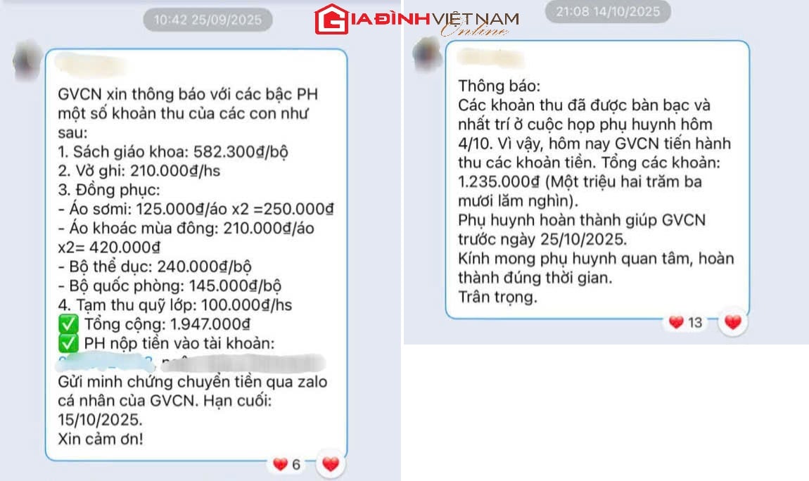Chị B chia sẻ: “Điều kiện kinh tế khó khăn, 2 vợ chồng đều là lao động tự do, năm nay cậu con trai bước vào năm học lớp 10. Đầu tháng 10, gia đình đi họp phụ huynh cho con sau đó cô giáo chủ nhiệm lập nhóm phụ huynh trên zalo. Cô giáo gửi trên nhóm zalo các khoản thu đầu năm và 3 khoản quỹ phải đóng. Tổng số tiền phải nộp lên tới hàng triệu đồng, trong khi đó tiền học phí đã được miễn”.