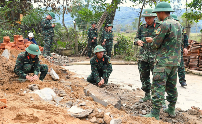 Lực lượng quân đội ra quân xây lại nhà cho người dân sau thiên tai mưa lũ. Ảnh: QK5