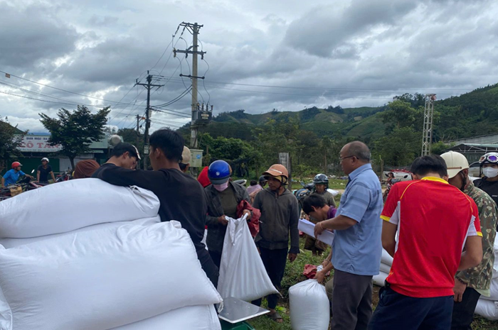 Người dân vùng thiên tai tiếp nhận hỗ trợ lương thực, thực phẩm từ chính quyền địa phương.