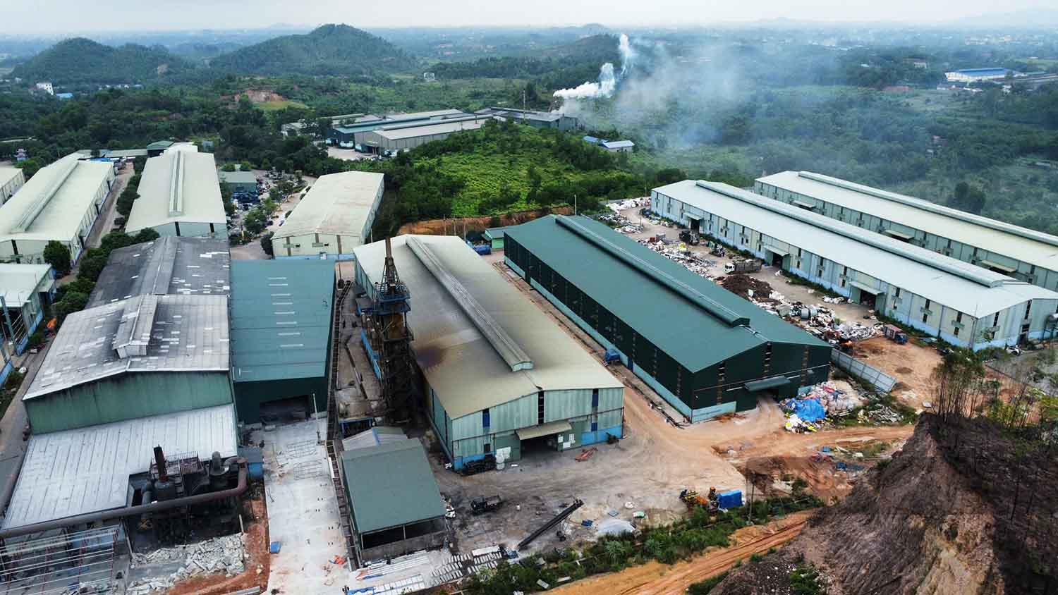 Ghi nhận của PV thời điểm giữa tháng 9.2025, bên trong nhà máy xử lý rác của Công ty Việt Xuân Mới hiện có ít nhất 2 lò đốt rác công nghiệp đang vận hành. Trong đó, 1 lò đốt nhôm phế thải chỉ cách khu dân cư xóm Đậu một gò đất, gần đó là các nhà xưởng mới đang được xây dựng.
